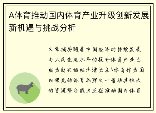 随着中国经济的持续发展与人民生活水平的提升,体育产业已成为新兴的经济增长点。A体育,作为国内领先的体育品牌之一,借助其强大的资源整合能力,正在推动国内体育产业的升级和创新发展。本文将从四个方面深入分析A体育如何推动国内体育产业的转型升级,探讨其带来的新机遇和面临的挑战。首先,A体育通过技术创新和数字化转型,提升了运动项目的观赏性和参与度;其次,A体育积极拓展跨行业合作,促进体育产业链的多元化发展;第三,A体育在体育文化建设方面的努力,为国内体育产业注入了新的活力;最后,A体育如何应对行业政策变化以及市场竞争,提出了有效的应对策略。结合上述分析,本文最后将对A体育在体育产业发展中的作用和未来前景做出总结与展望。